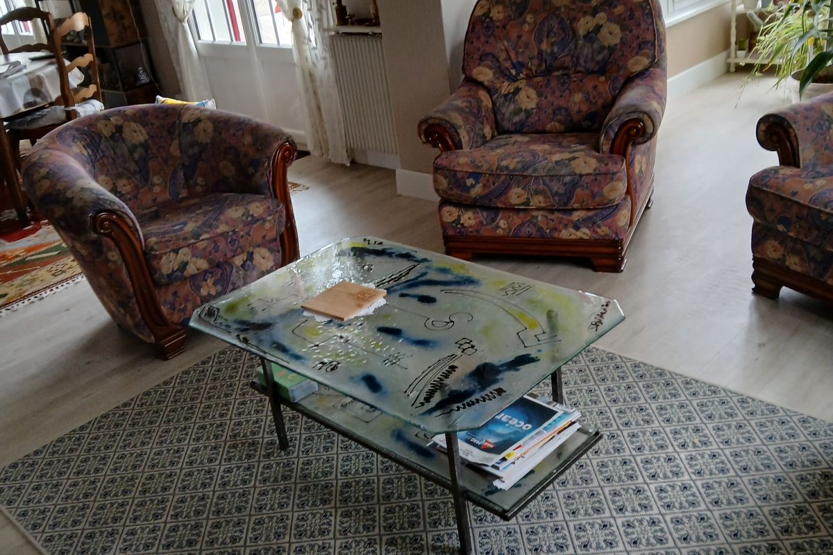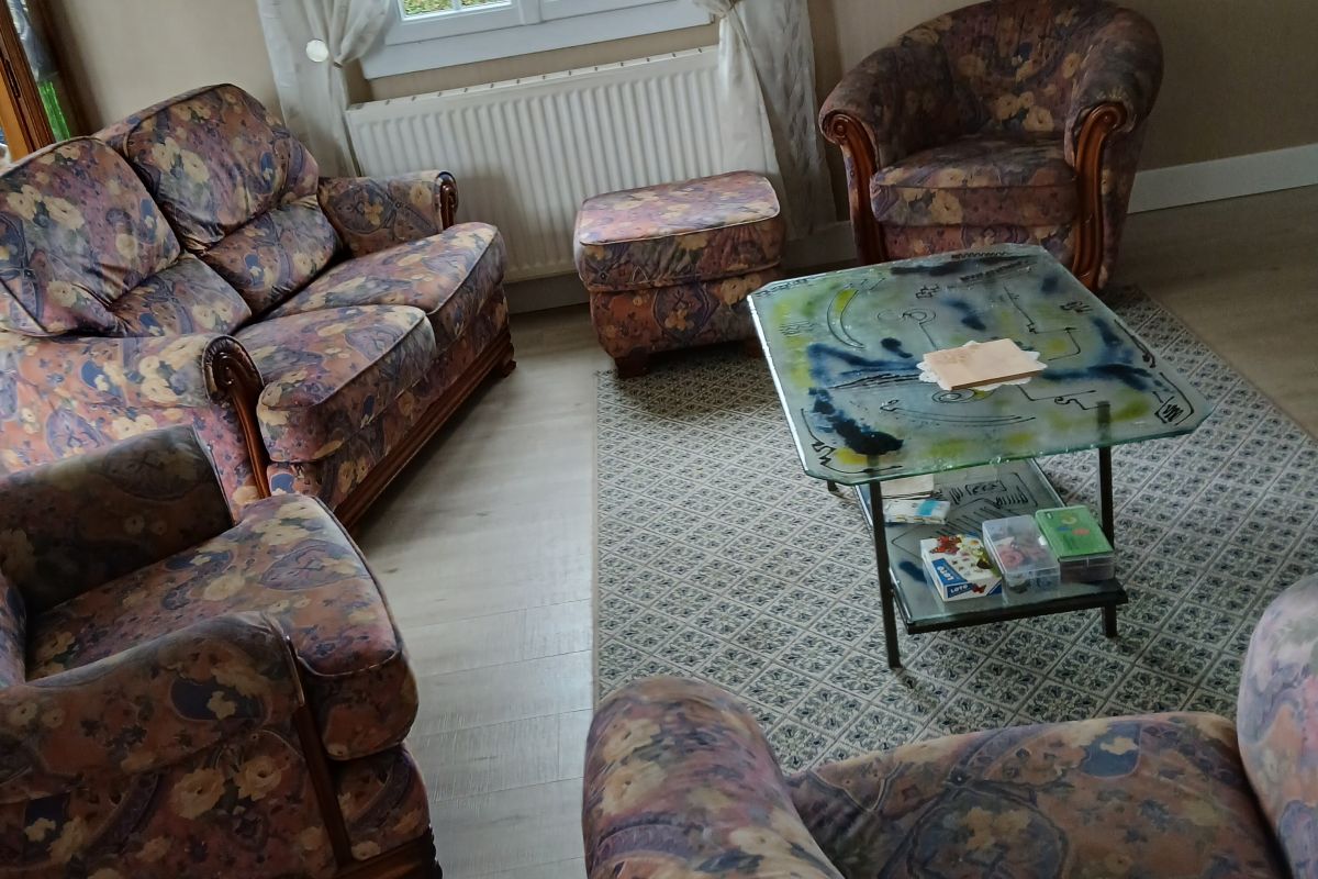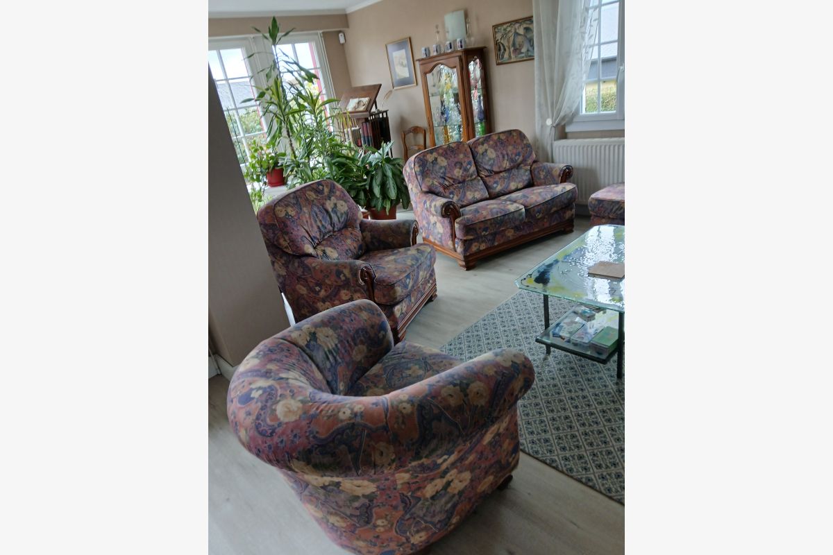 Salon 5 pièces : canapé 2 places, 2 cabriolets, 1 fauteuil, 1 pouf Revêtement tissu. Très bon état.
