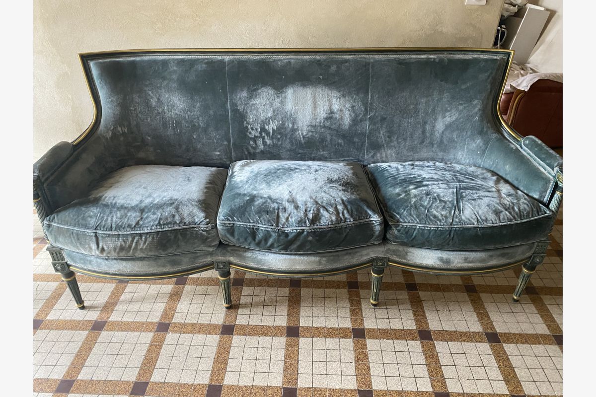 velours lisse bleu, bon état, 180 cm, long x 0,73 cm, profondeur x 93 cm haut