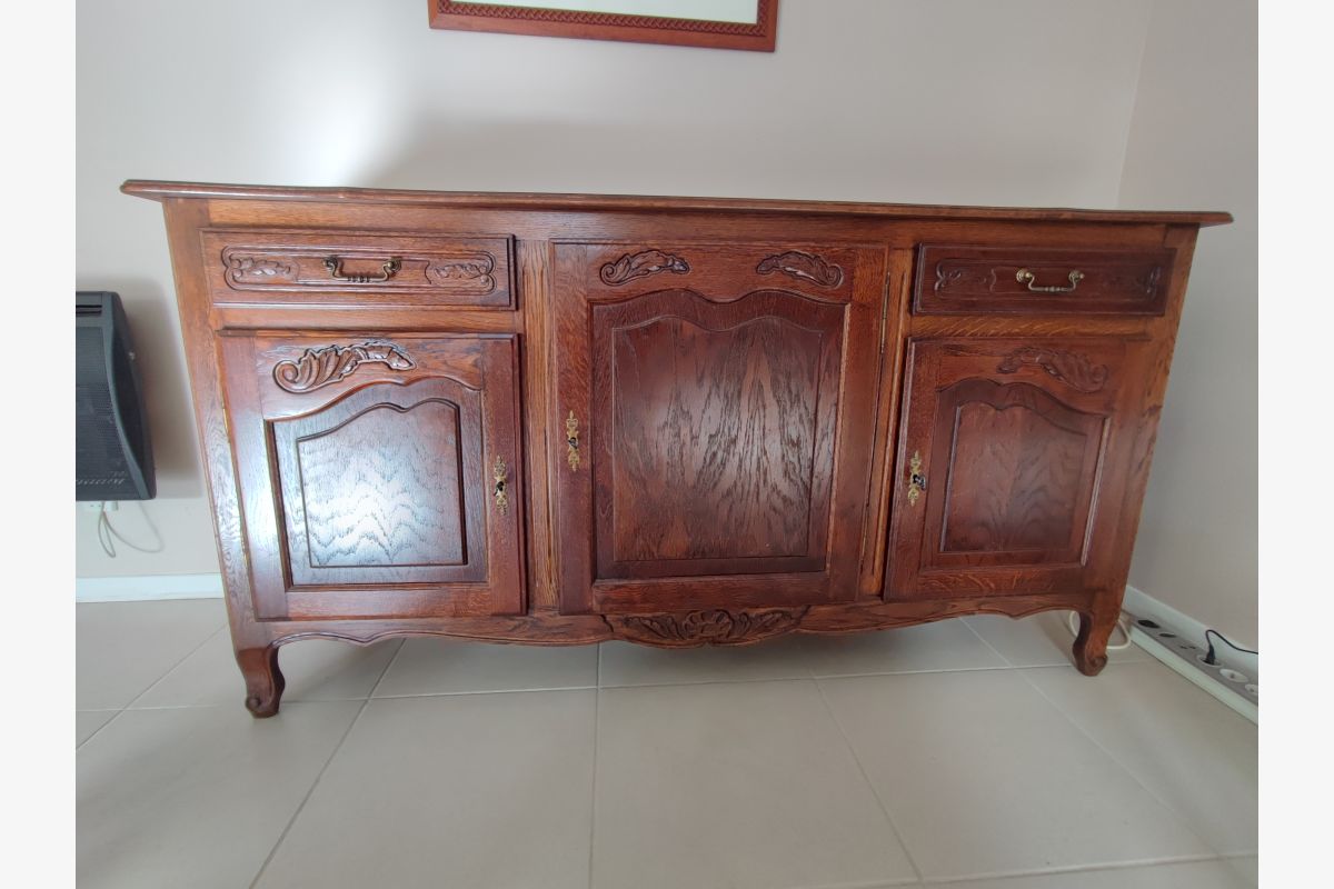 Vends buffet bas 3 portes, 2 tiroirs, couleur chêne foncé. dim L : 180, P: 50- H:95. En très bon état. A retirer sur place. Paiement en espèces.